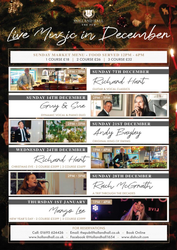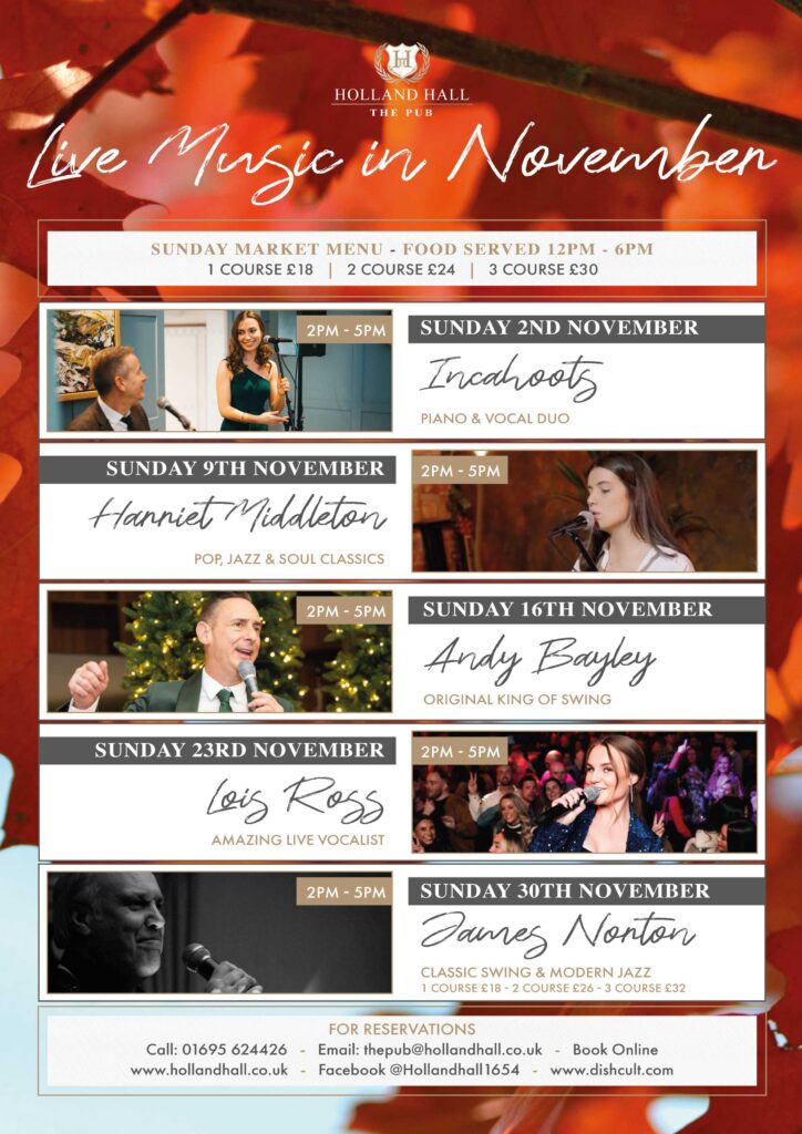 To make a reservation, please call 01695 624426 or email us at info@hollandhall.co.uk