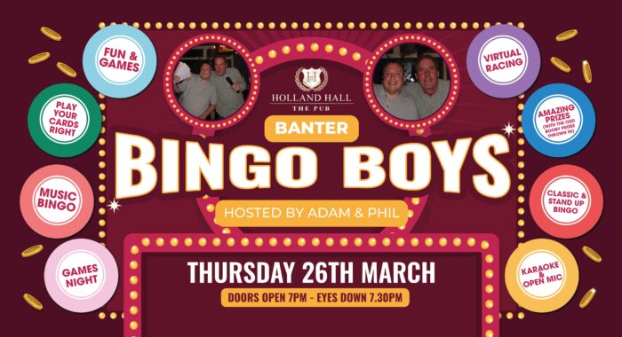 Banter Bingo Boys in March at The Pub at Holland Hall Hosted by Adam & Phil! Thursday 26th…